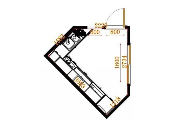 厨房是一个多边形的空间,尖角位很难利用。设计师做了一段转角橱柜做了操作台,刚好填平了转角位,搭配吊柜形成一个很实用的美食操作区域。