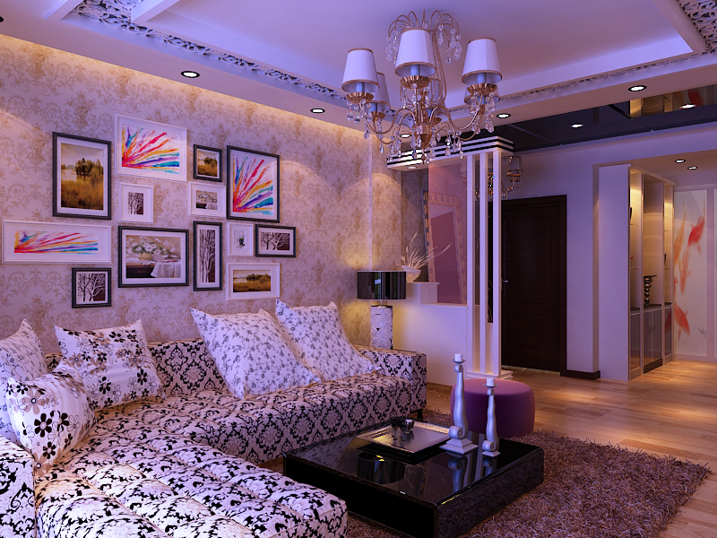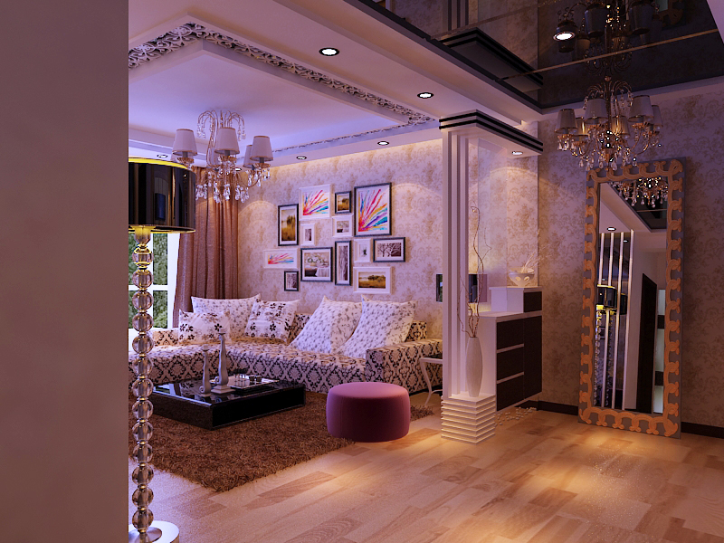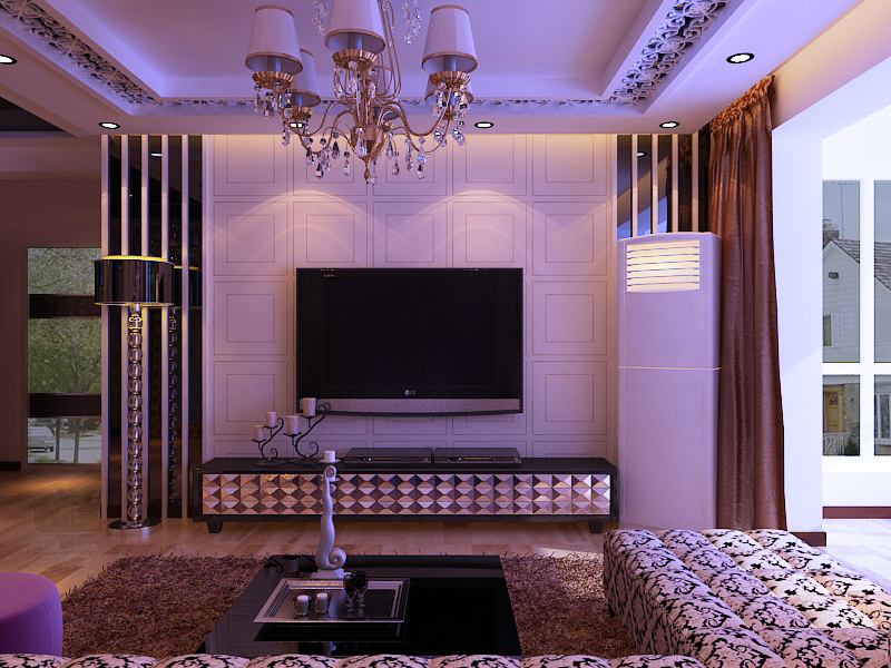 保利五月花105平房子   设计师用现代设计搭配 ,大厅吊顶采用镂空点缀,增加一种现代艺术美丽,电视背景墙采用镜片点缀更时尚。